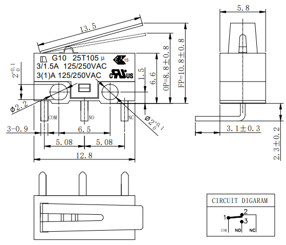 The Микропереключатель 12,8×5,8 мм Это экономичный вариант средней компактности. Его основные преимущества: размер, который
